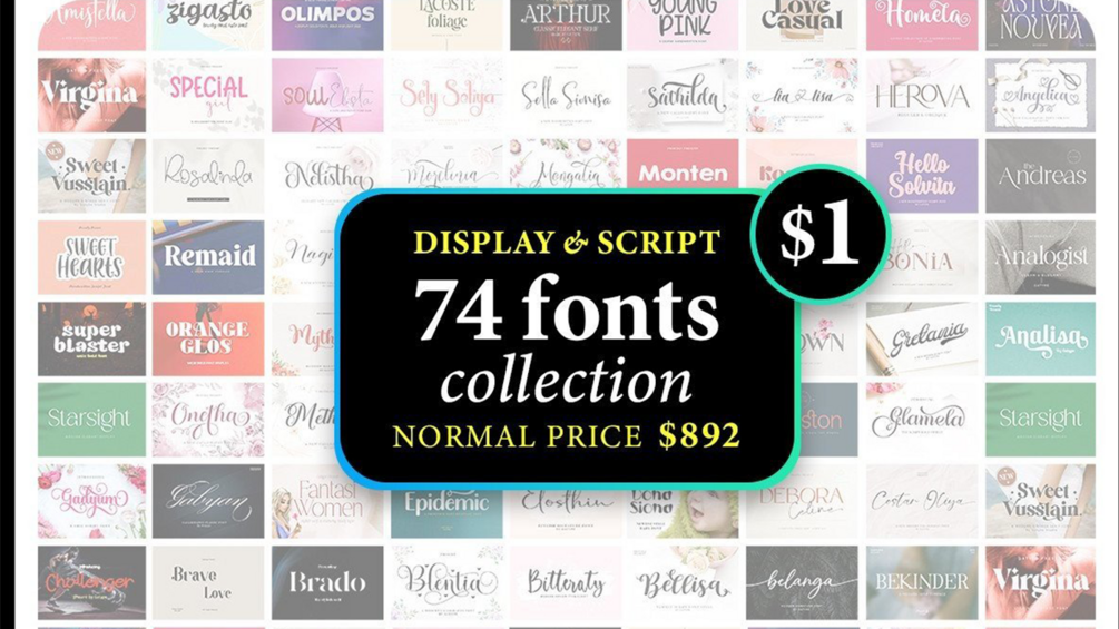 Display and script font collection, get 74 fonts at a super low price of just $1! Purchased separately these fonts are worth $892. This bundle includes a varied range of font styles with hundreds of glyphs, alternates, ligatures, and international language support.